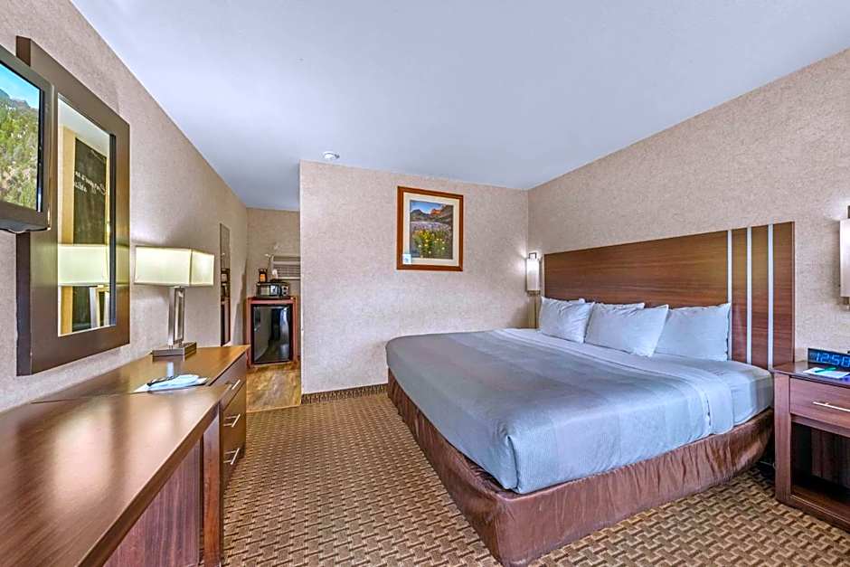 This room features a flat-screen TV, a microwave and a small refrigerator. An private bathroom with a hairdryer is also included.